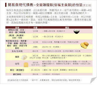 (註1)於搜尋網路搜尋” 食物代換表”,即可查到一個可下載的PDF檔,裡面有包括主食類食物等六大類食物的常見食物份量資料。